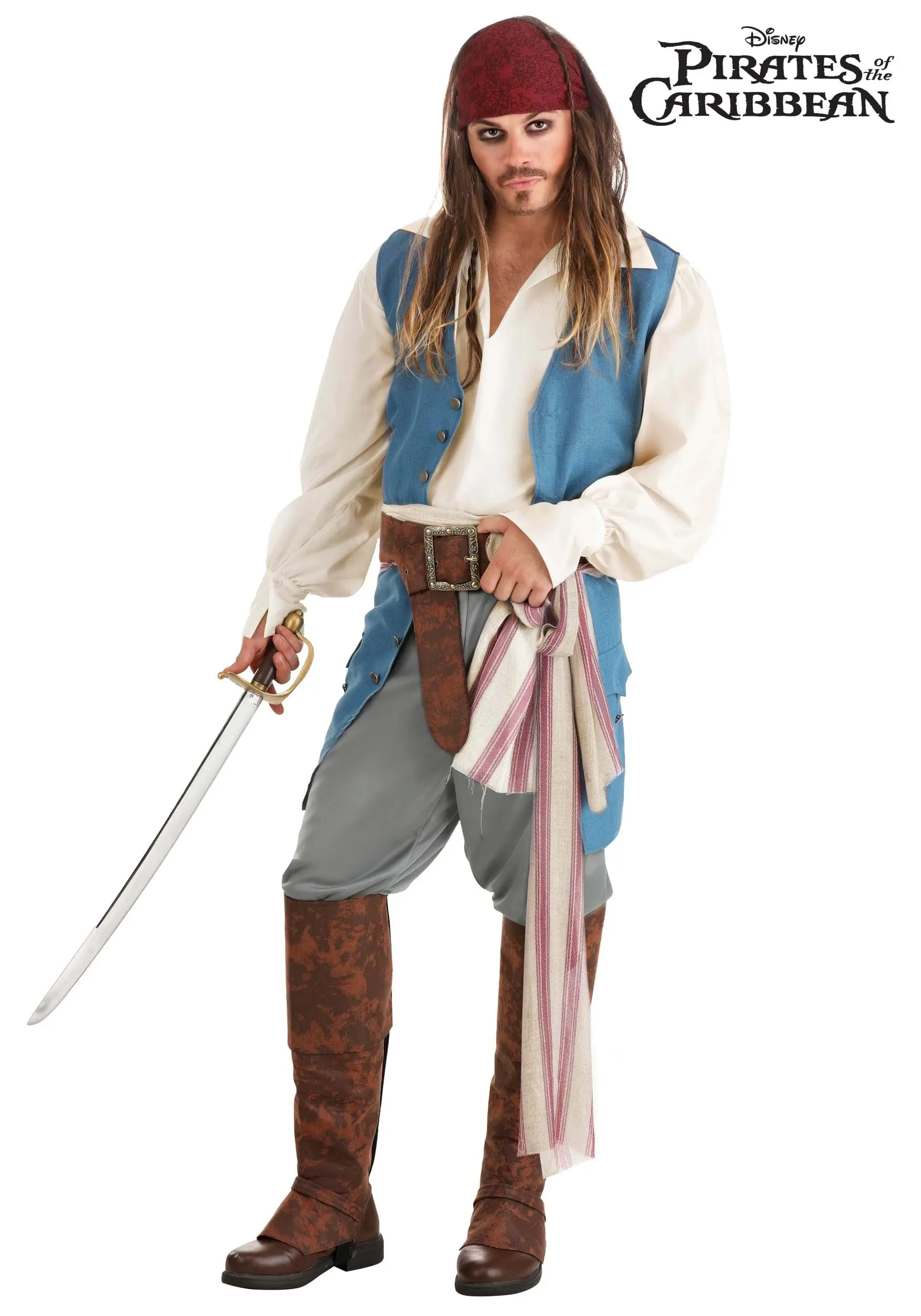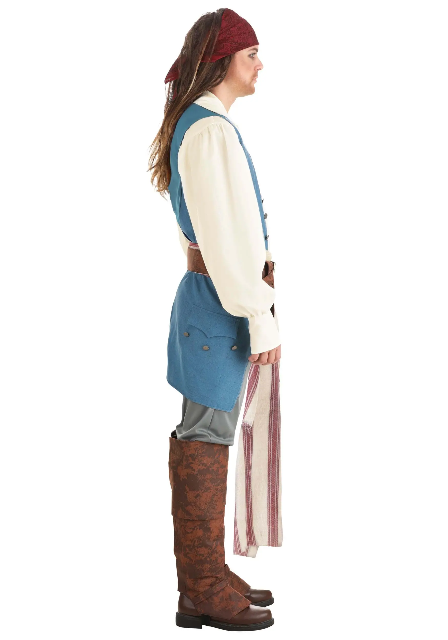 This adult costume is officially licensed from Disney’s Pirates of the Caribbean series. It takes inspiration from his main outfit and comes with many pieces to help you look the part! The costume outfit starts with a white shirt and a vest. It also comes with a pair of brown pants and a pair of boot covers that fit over your own shoes. The belts and sashes included help give you a bit of swashbuckler style. The finishing piece comes in the form of a red headscarf, which can be tied around your head to provide you with that classic Captain Jack Sparrow appearance! When you have the whole ensemble on, even a nasty Kraken will have a tough time trying to catch you.