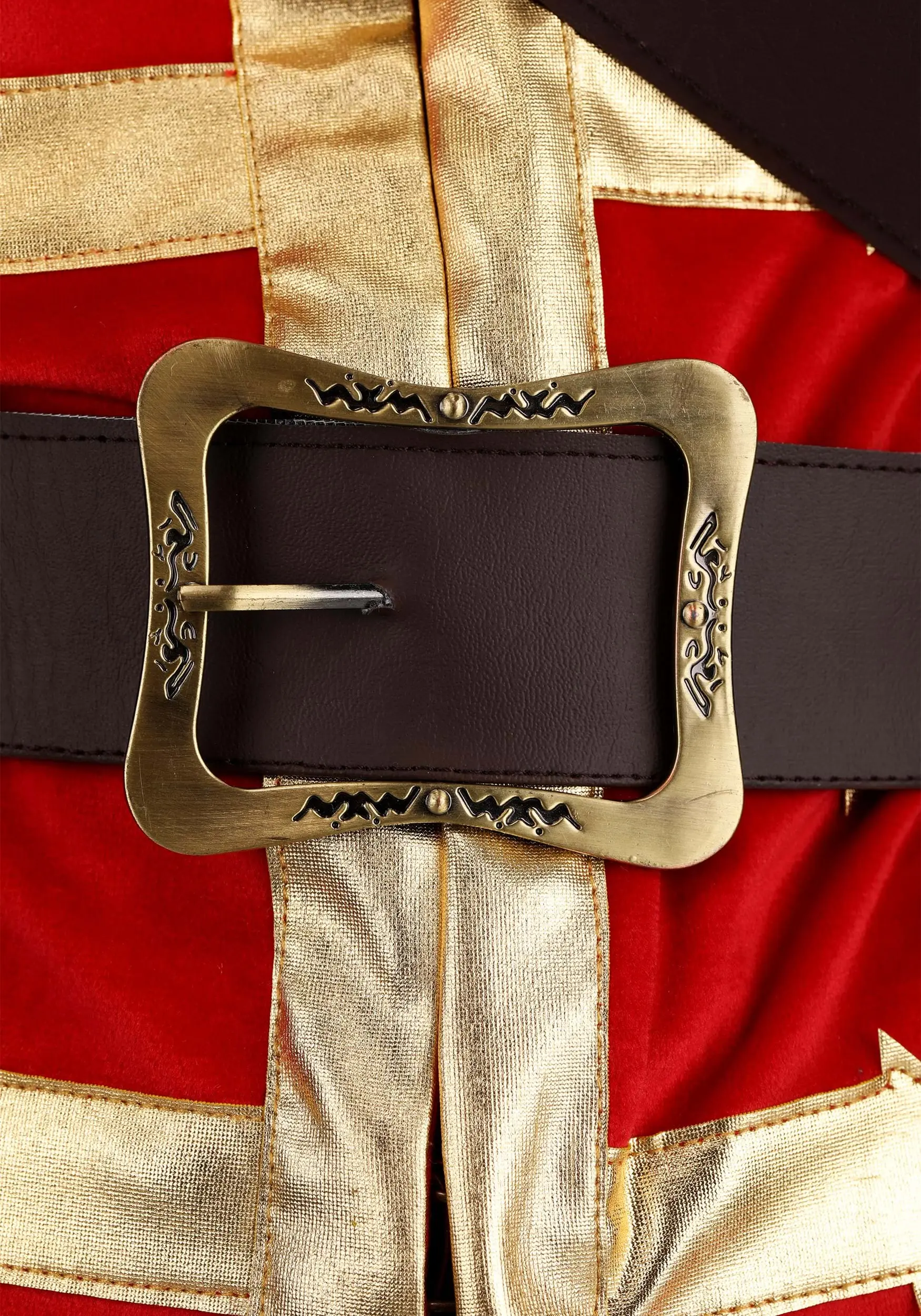 Take on all the regalia of a leader with this gold trimmed costume. The two brown belts and white jabot give a bit of extra flair to the look, indicating that you know what fashion is, even out on the high seas. The cape completes the look of an accomplished scallywag. Give it a dramatic spin for pomp wherever your sea legs bring you. A head scarf and hat top everything off and will give you some added height for your crew to look up to!