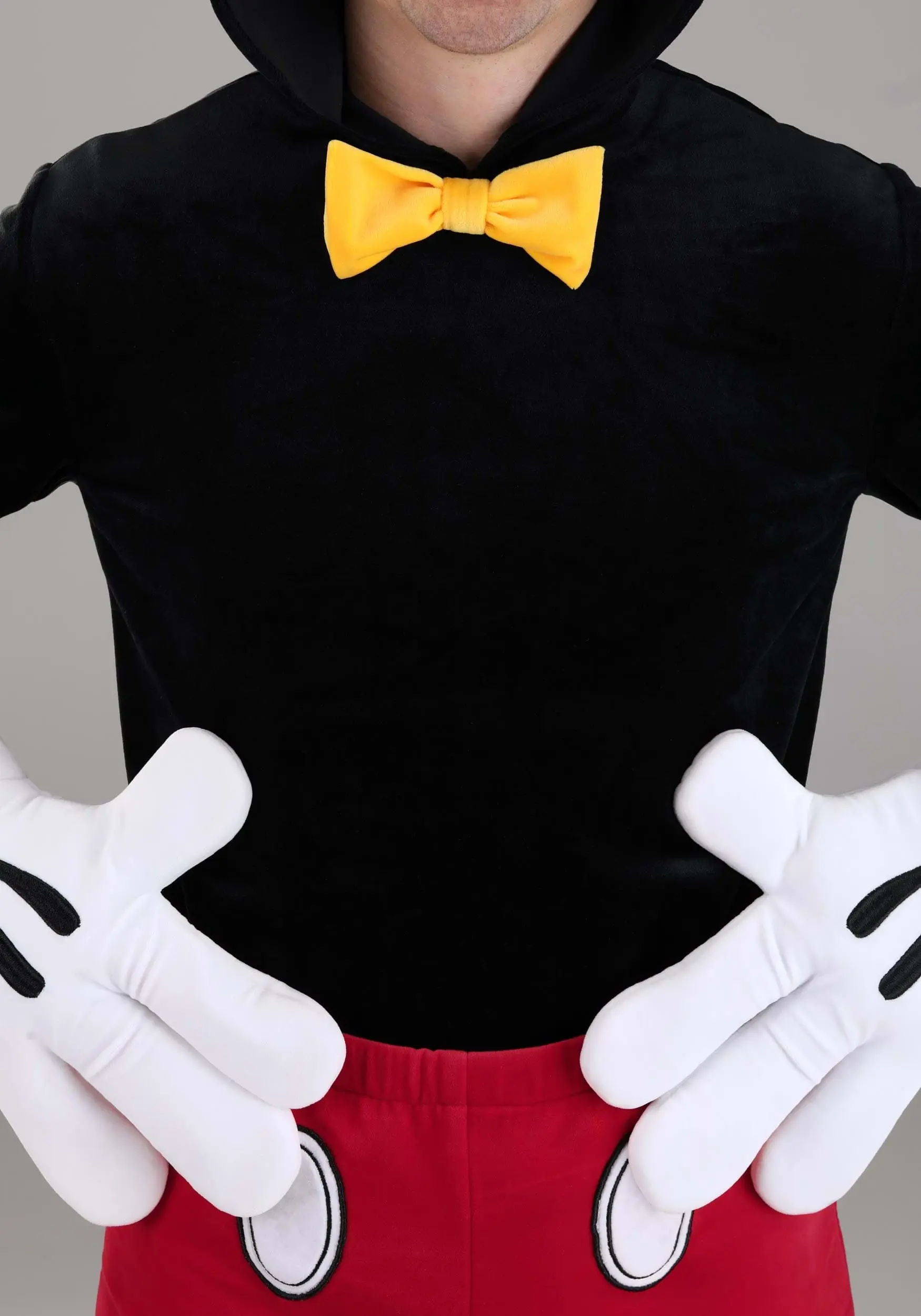 Next is a hooded shirt that includes a charming yellow bow tie and Mickey’s ears on the hood. The stuffed white gloves and yellow shoe covers provide the finishing details. You’ll look and feel just like this classic character whenever you put on this charming costume!
