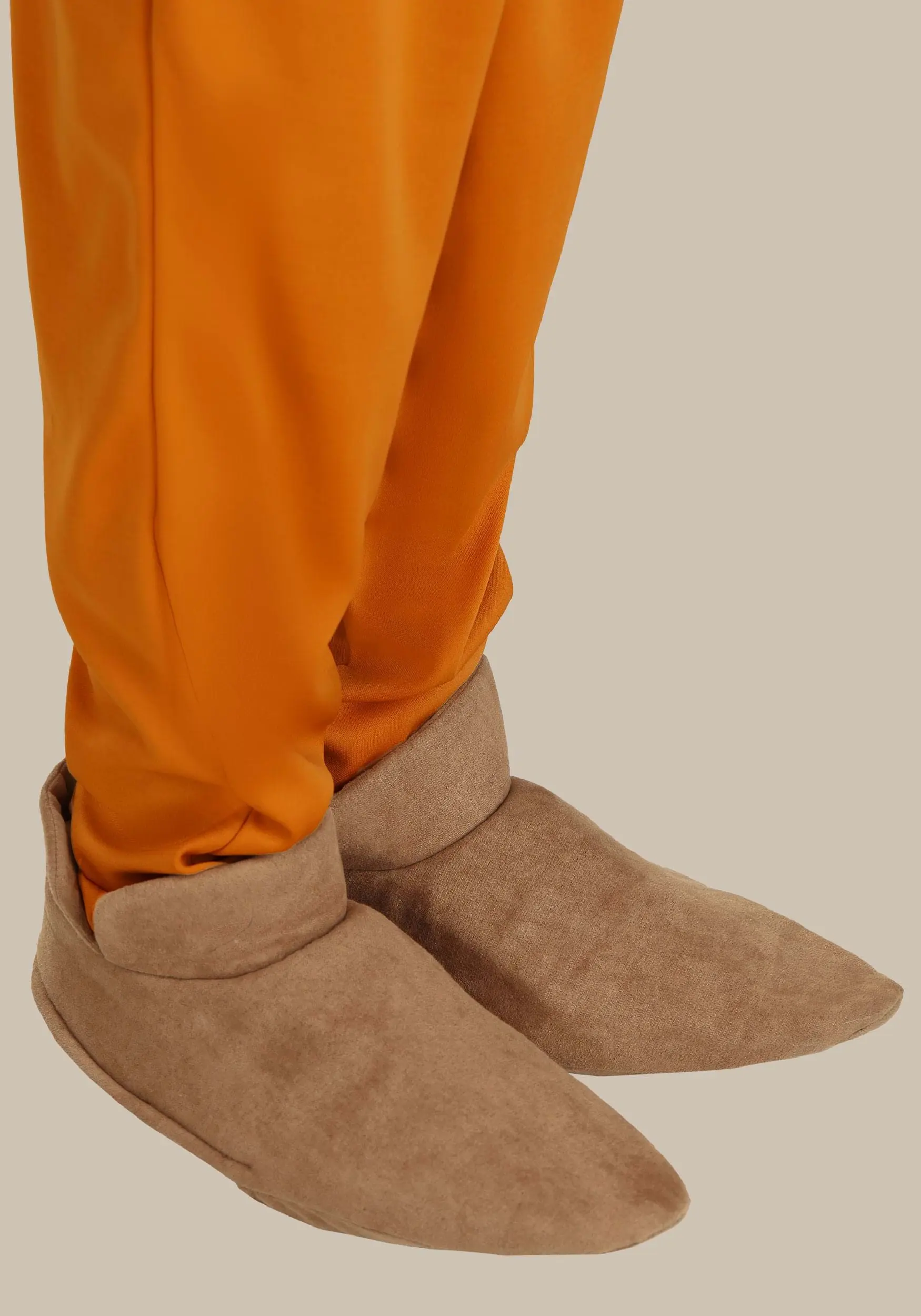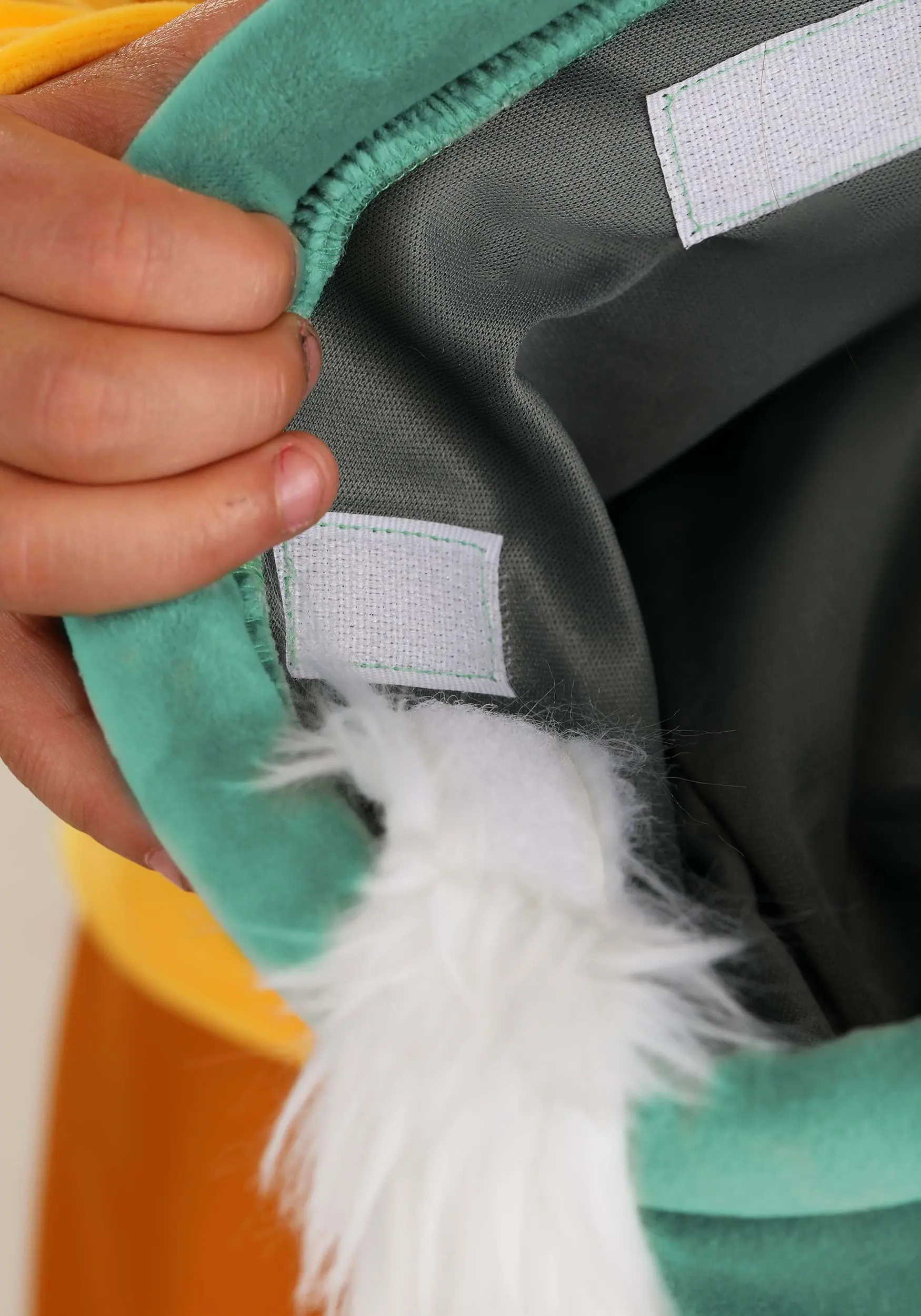 The outfit starts with tan pants and a bright yellow shirt, which includes sewn-on details like buttons and elbow patches. The belt completes the top of the outfit, and the shoe covers help your kid’s favorite footwear look distinctly dwarven. The hat with attached beard adds just the right finishing detail. Your kiddo will be ready to work in the diamond mines or trick-or-treat when they put on this cute costume!