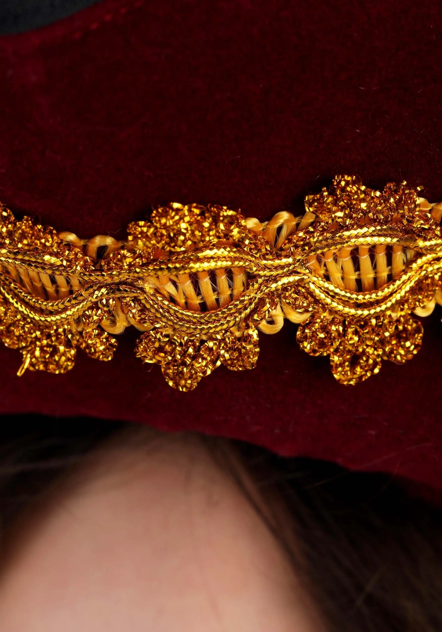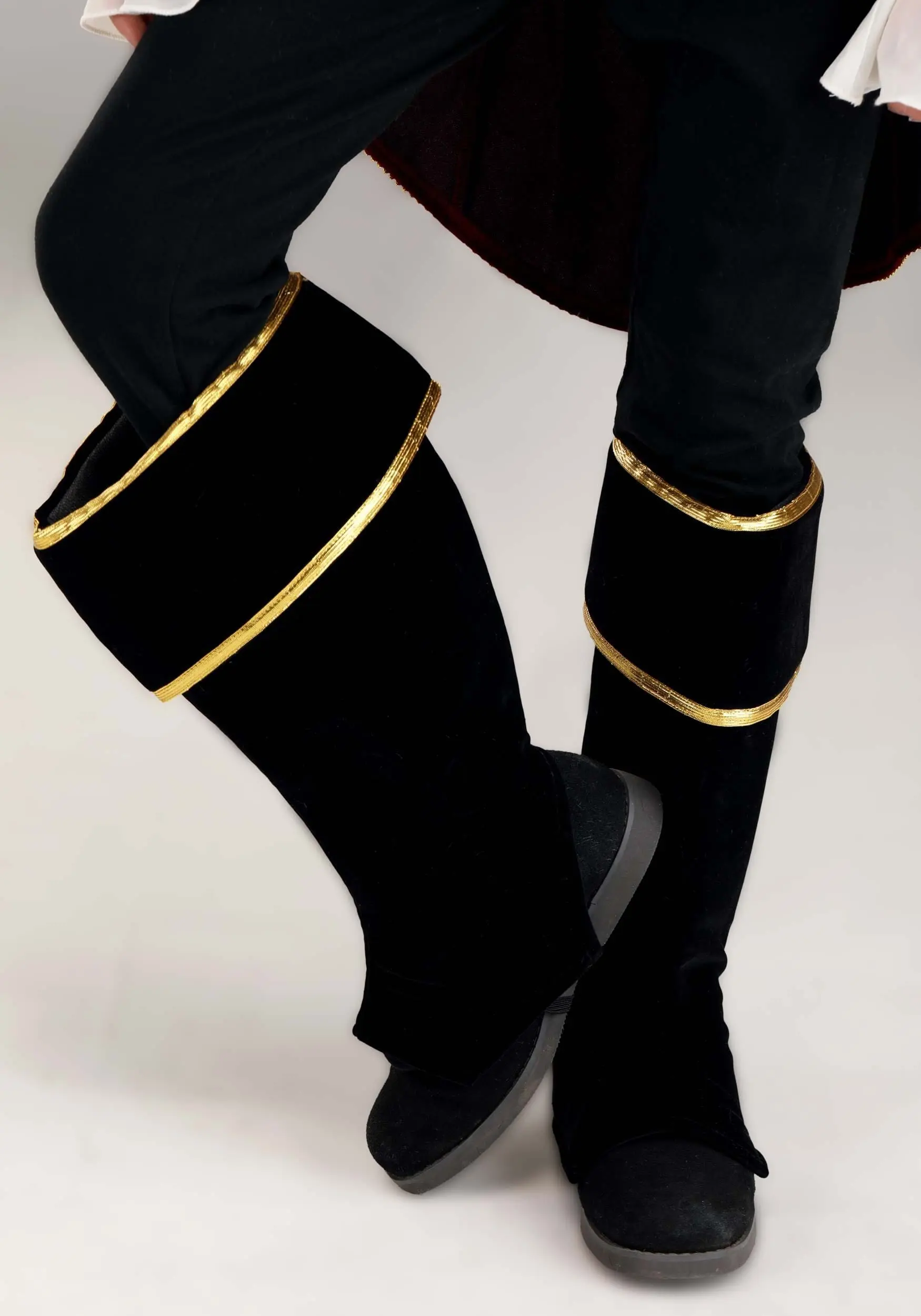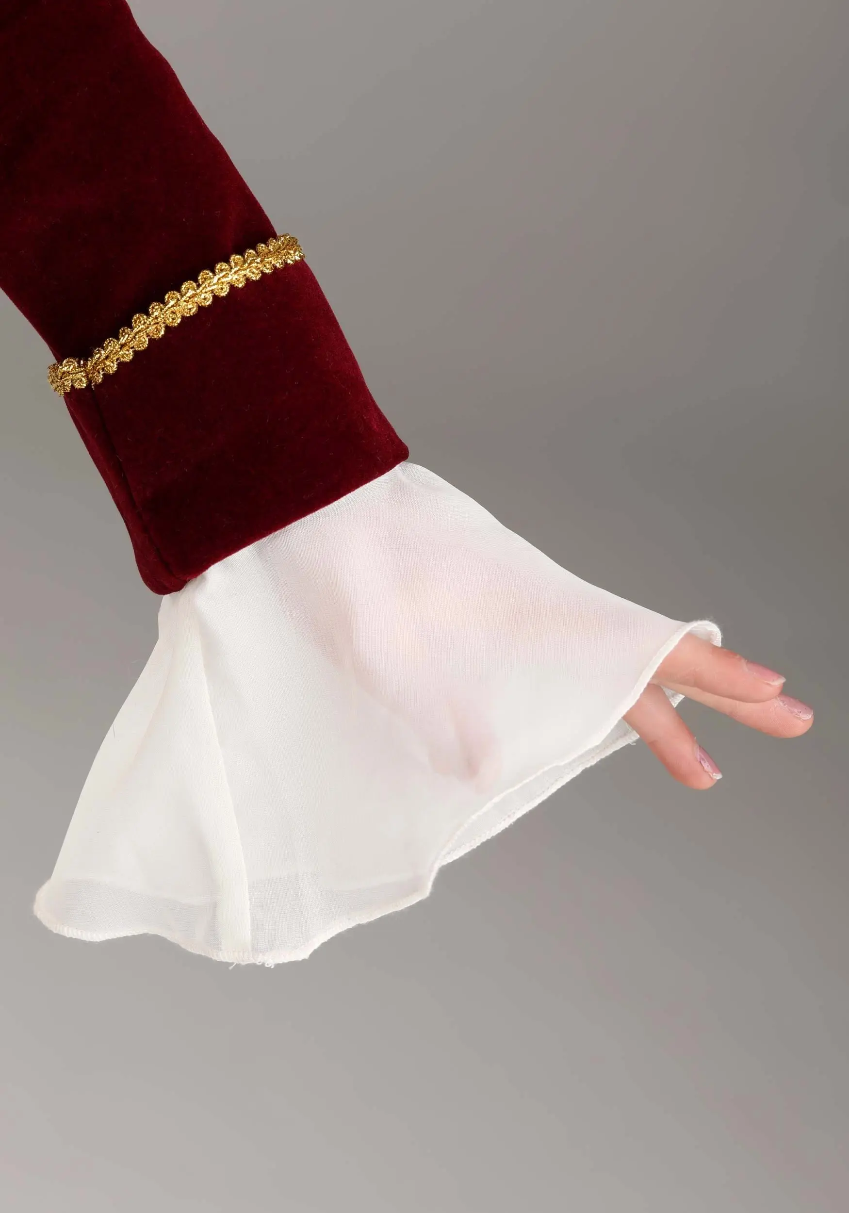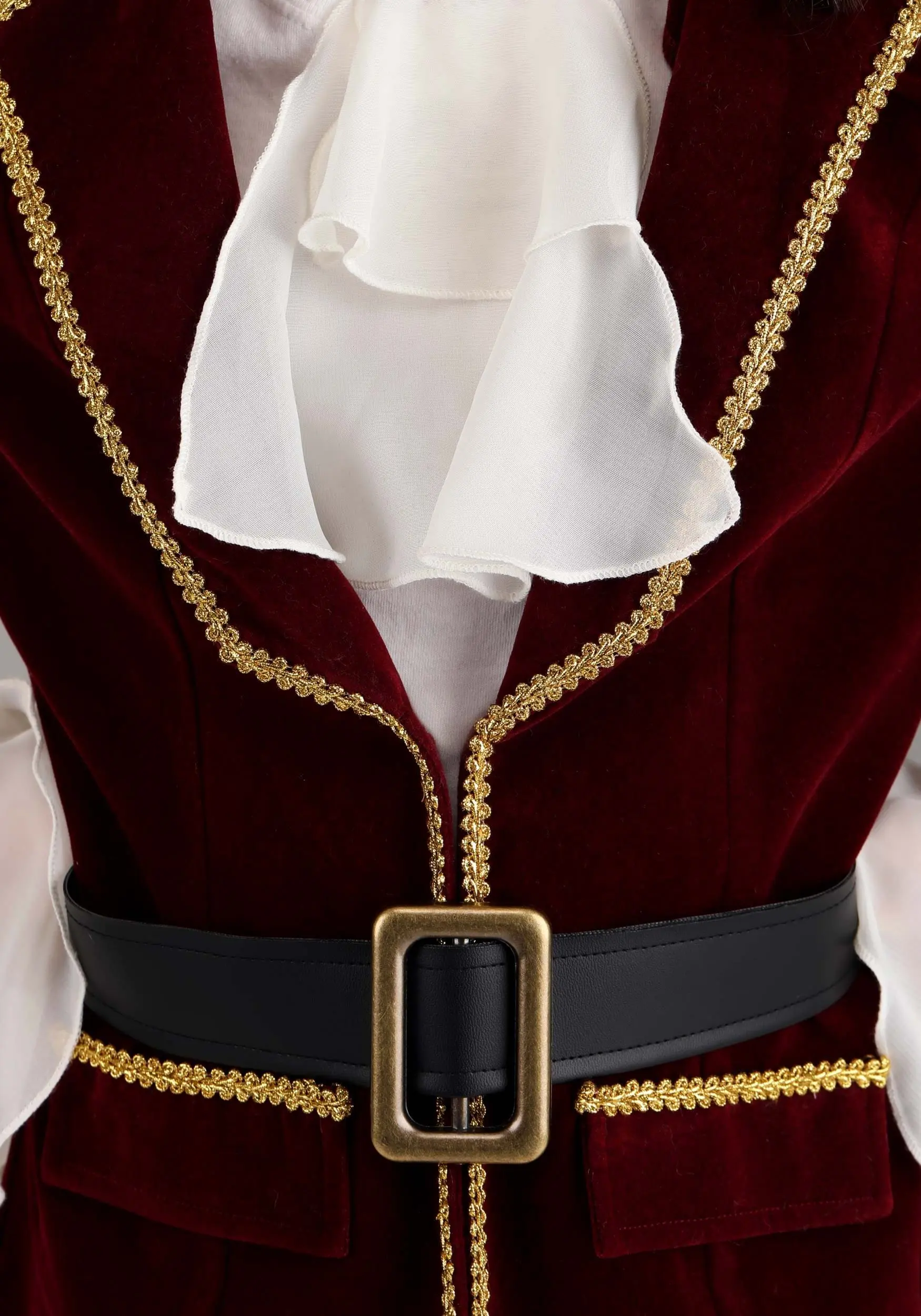 Be swashbucklingly sensational in your exclusive Kid’s Captain Hook Costume! The unisex outfit includes a long jacket made of deep red velvet and decorated with golden trim along the edges and faux pockets. The snowy white neck scarf fastens in the back and its frills look amazing against the jacket’s neckline. The black faux leather belt fastens around your waist, accented by a gold-tone plastic slide buckle. Foam-backed velvet boot tops secure under your feet with attached elastic bands. The red tricorn hat can be shaped as desired thanks to a hidden wire and is trimmed with a feather and golden accents.