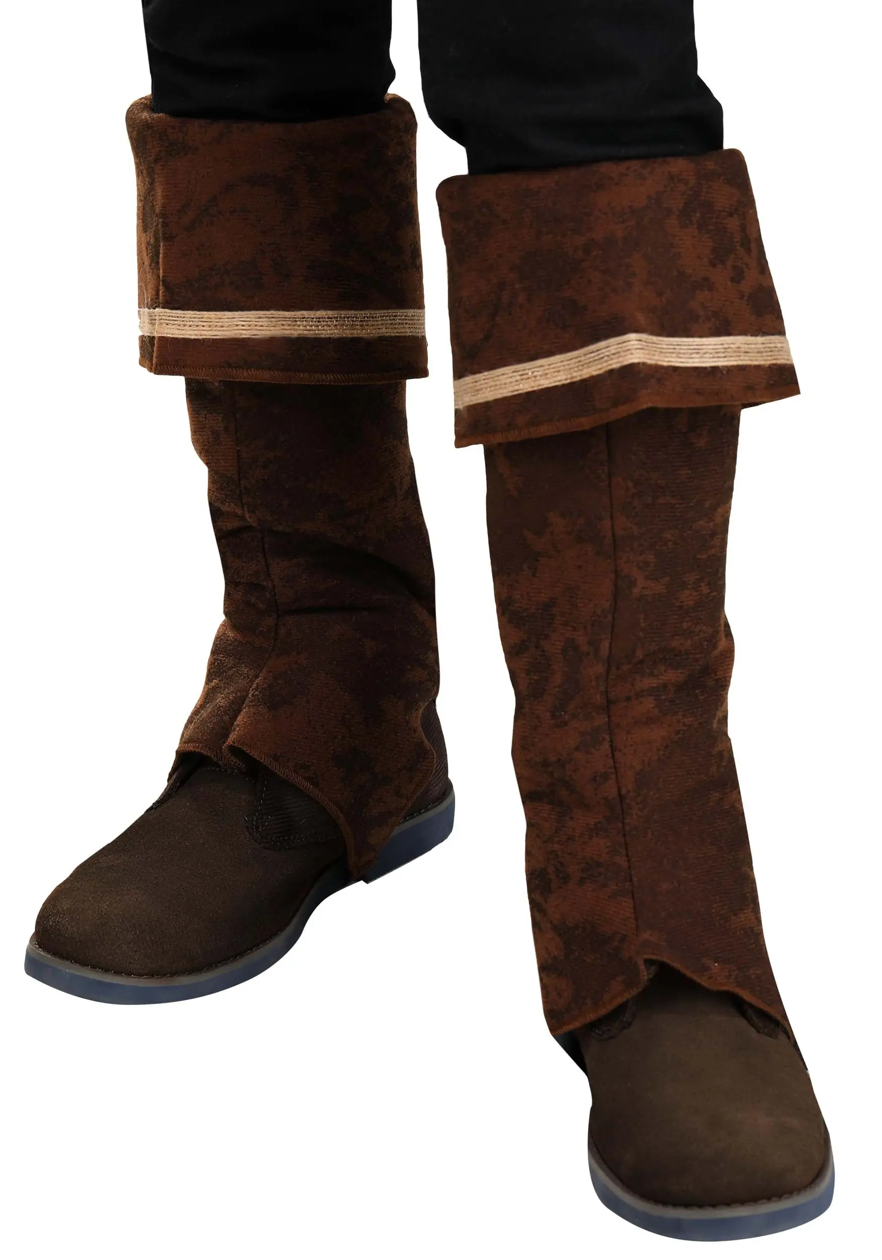 - Foam-backed faux suede boot tops have elastic bands under foot, folded-over cuffs w/ same braid trim as jacket