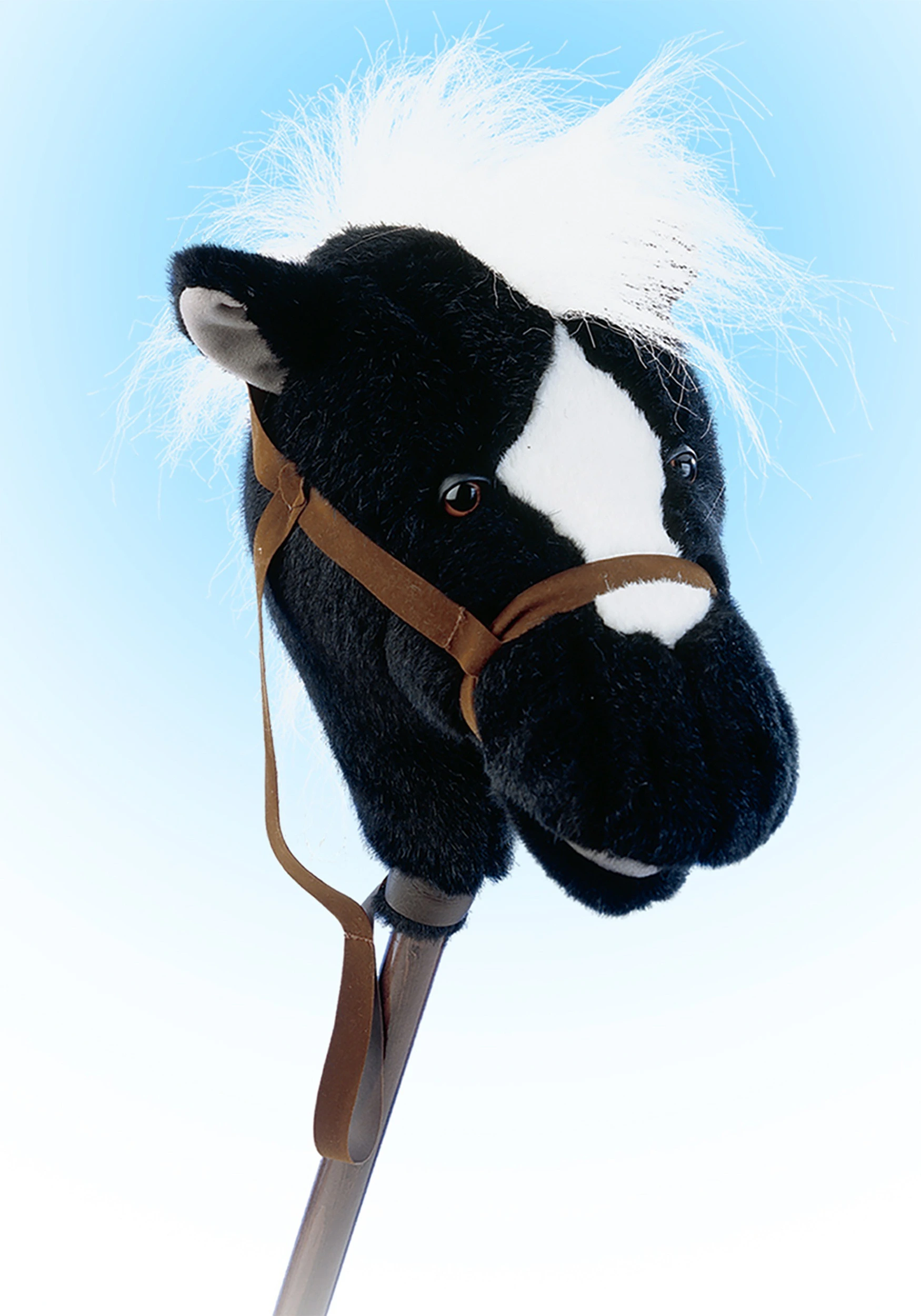 - Head has button eyes, white forehead blaze, faux suede reins