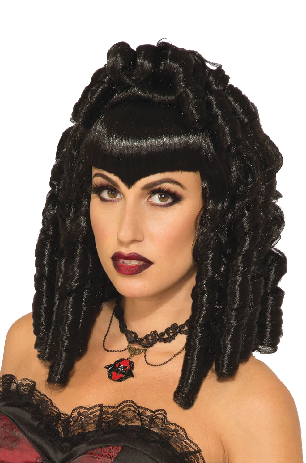 Become Transylvanian royalty with this beautiful wig! With barrel curls and a V-shaped bang, this wig is perfect for your regal vampire costume! Add some fangs and dark jewels to complete your Transylvanian transformation!